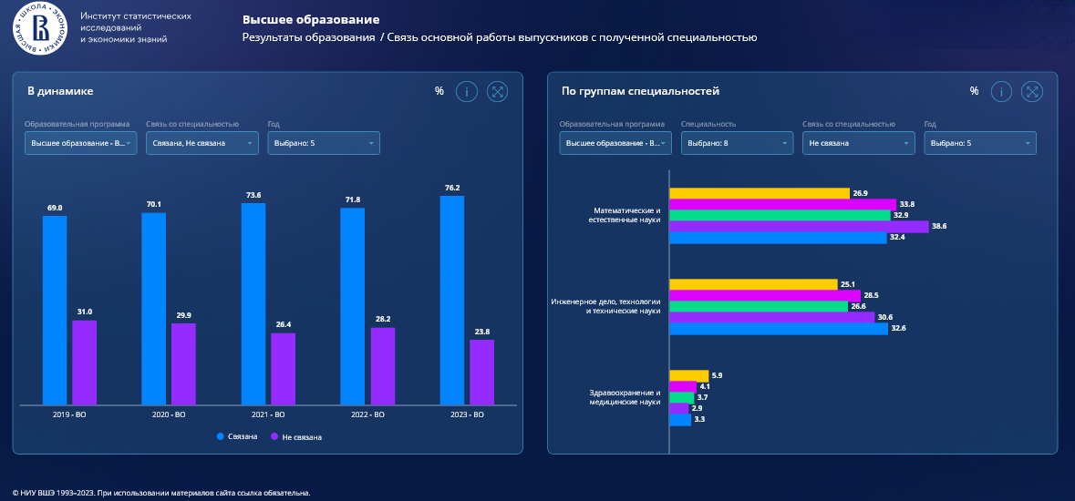 Низкая доля работающих по специальности среди гуманитариев и тех, кто учился сельскохозяйственной деятельности: чуть больше 50%. А единственное направление, где большинство меняет профессию после окончания обучения, — педагогическое. По специальности из педагогов работают только 35%.