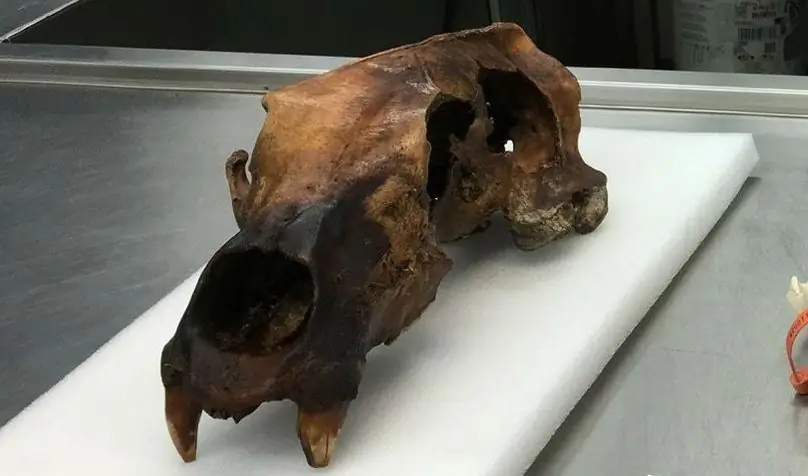 Найденный череп животного имеет удлиненную затылочную часть, что позволяет предположить принадлежность животного к особому виду хищников, о котором до сих пор ничего неизвестно.