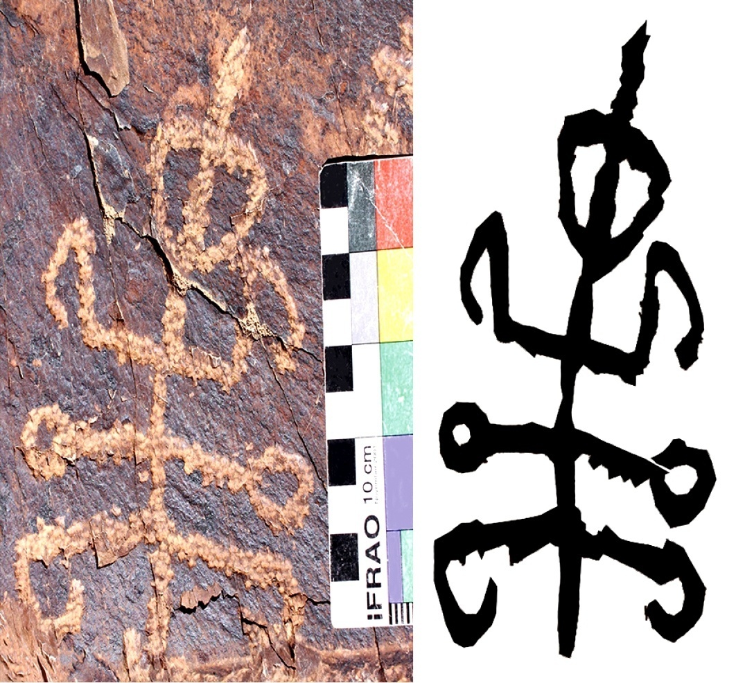 Необычный петроглиф демонстрирует «треугольную голову с вертикальным расширением, большими глазами, открытыми передними ногами, промежуточными петлями в середине ног и изогнутыми задними ногами».