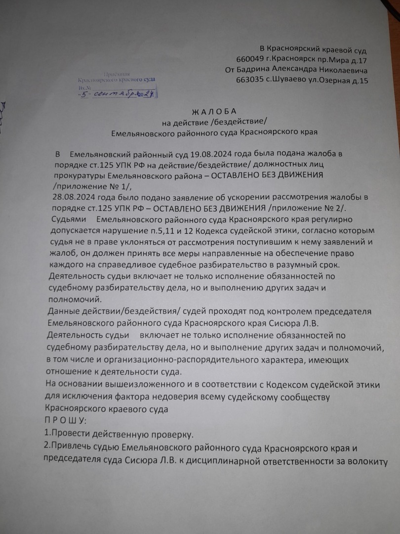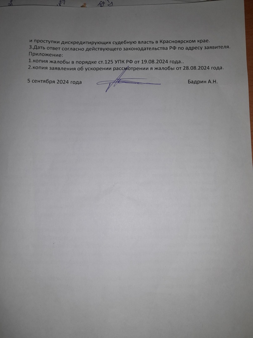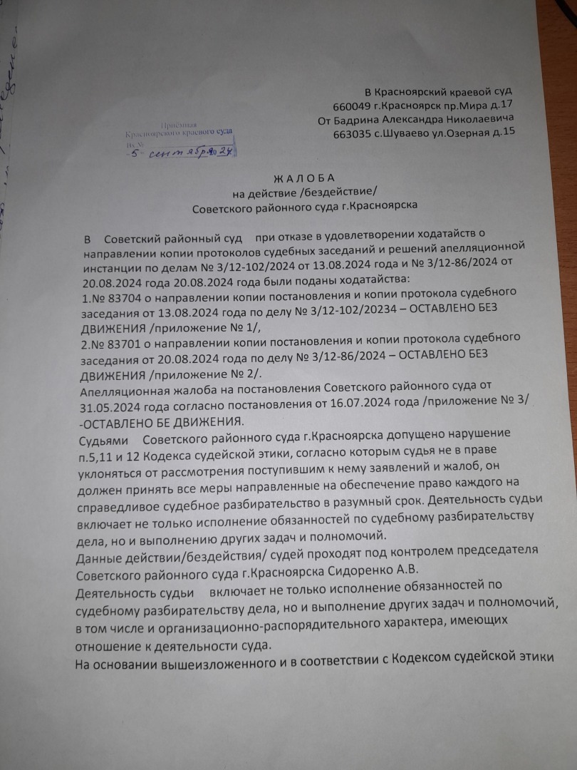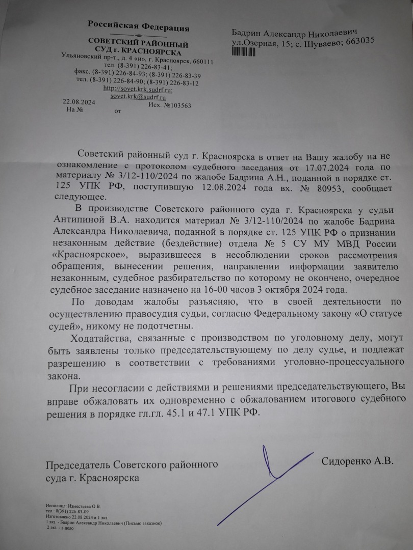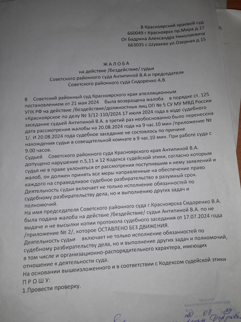 20 августа 2024 года подаю жалобу и скорее всего информация ушла в Советский суд г.Красноярска,потому что 22 августа уже готов ответ где председатель суда сославшись на Федеральный закон " О статусе судей" расписался в своей беспомощности