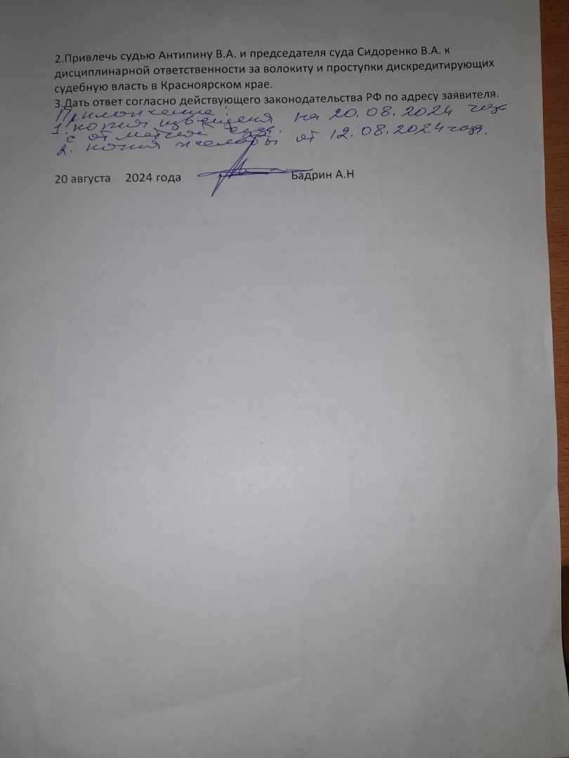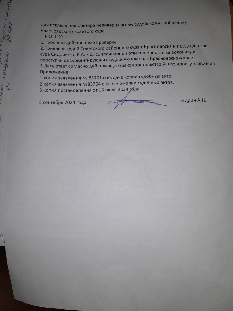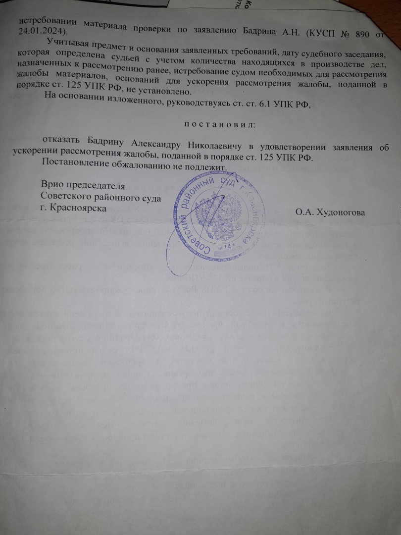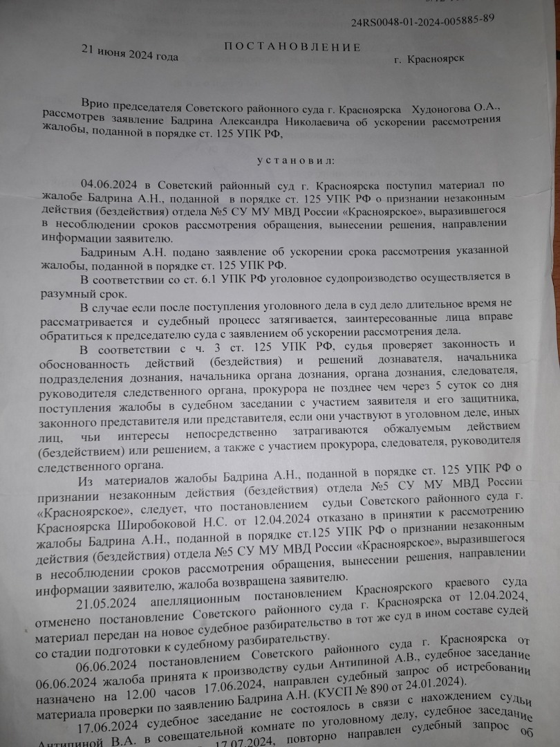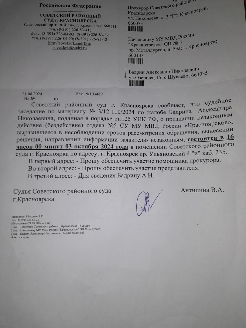 20 августа 2024 года подаю жалобу и скорее всего информация ушла в Советский суд г.Красноярска,потому что 22 августа уже готов ответ где председатель суда сославшись на Федеральный закон " О статусе судей" расписался в своей беспомощности