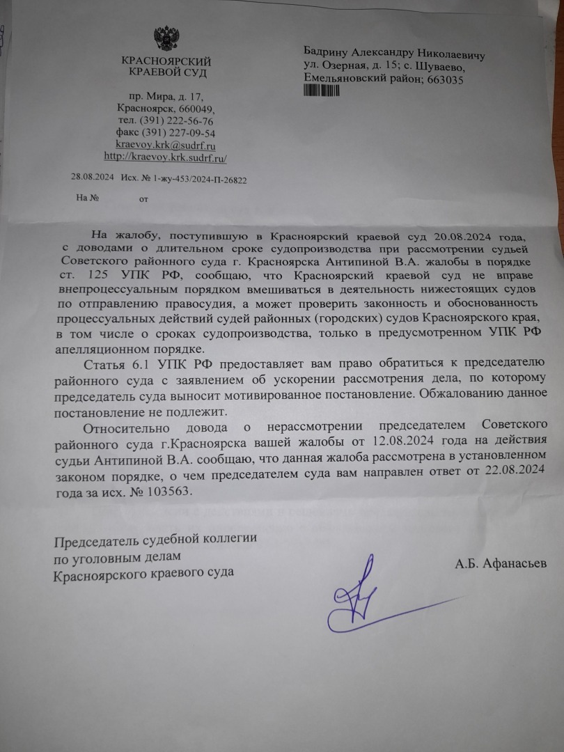 и вот сегодня пришел ответ с Красноярского краевого суда