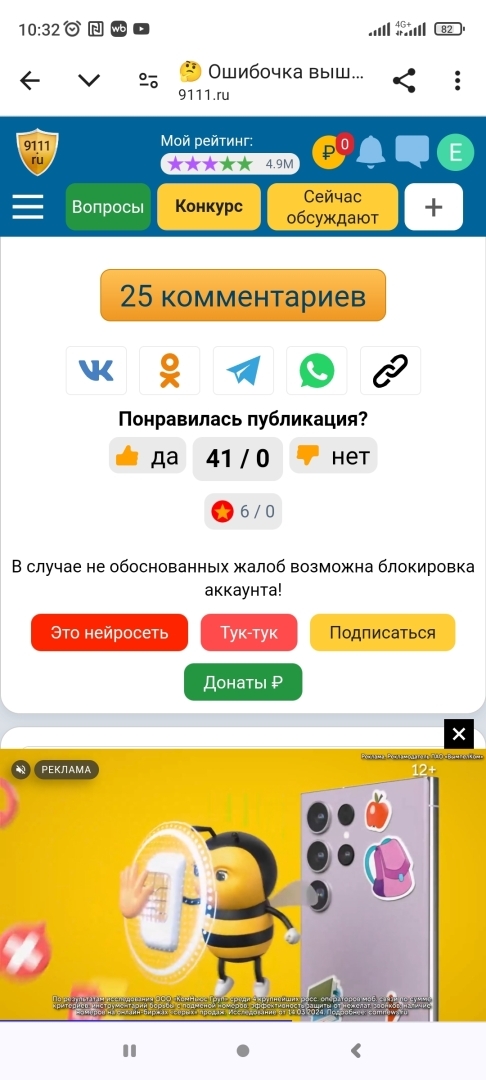 Да, я оплатила комментарий, чтобы он был самый первый! Чтобы стукачи знали, что они стукачи! Есть новая кнопка "Нейросеть", если стукач это заметил или специально хочет навредить автору, то он её нажимает! И утром приходит администрация и удаляет публикацию. Обратите внимание у других есть слово "Нейросеть" под лайками! А у меня нет))