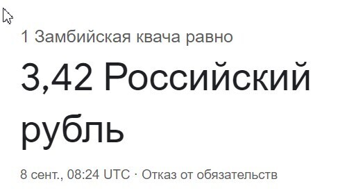 Ну, а насчет рубля. Помню при СССР меня всегда веселило (особенно отношение итальянской лиры) по отношению к рублю, рубль был выше доллара и я был горд за валюту своей страны. Но что происходит сейчас? Рубль ПЕРЕОЦЕНЕН??? То есть он очень сильно крепкий? Кто тогда мне объяснит - где находится Замбия и что это за страна, и чем она такая великая, что ее валюта ДОРОЖЕ рубля??? Скрин на 8 сентября.