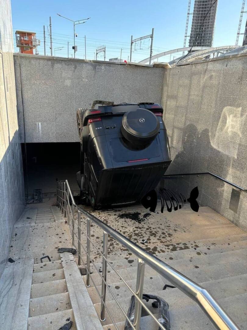 От удара у машины отлетело переднее колесо, а водителя зажало в салоне. Его удалось спасти, чего точно не скажешь о машине — скорее всего, далеко она больше не уедет.