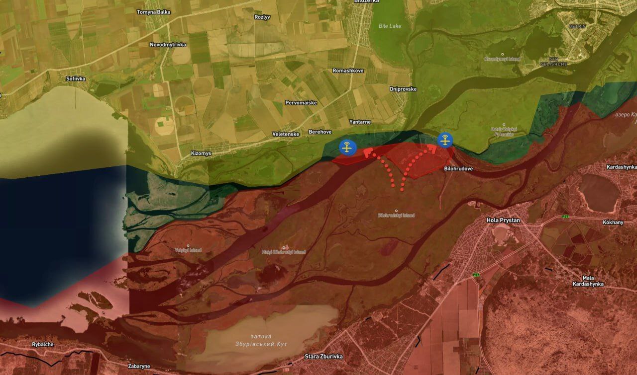 ВС РФ форсировали Днепр и создали небольшой плацдарм южнее села Янтарное.