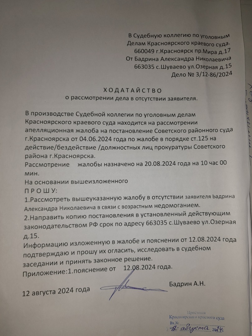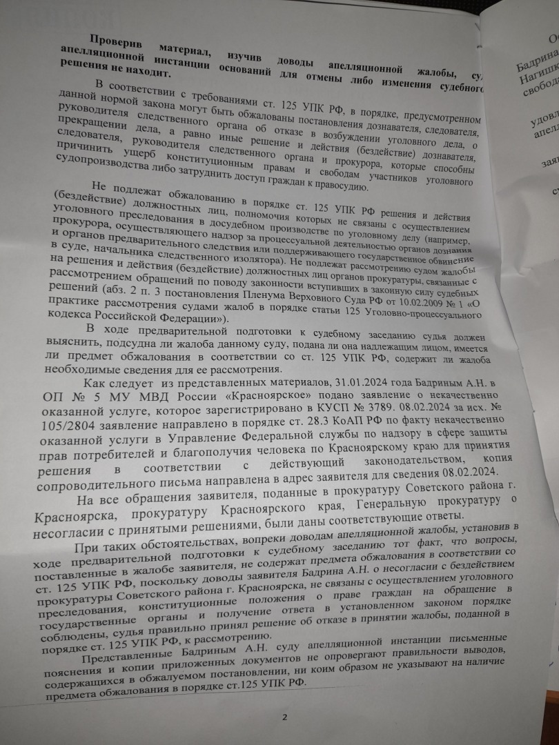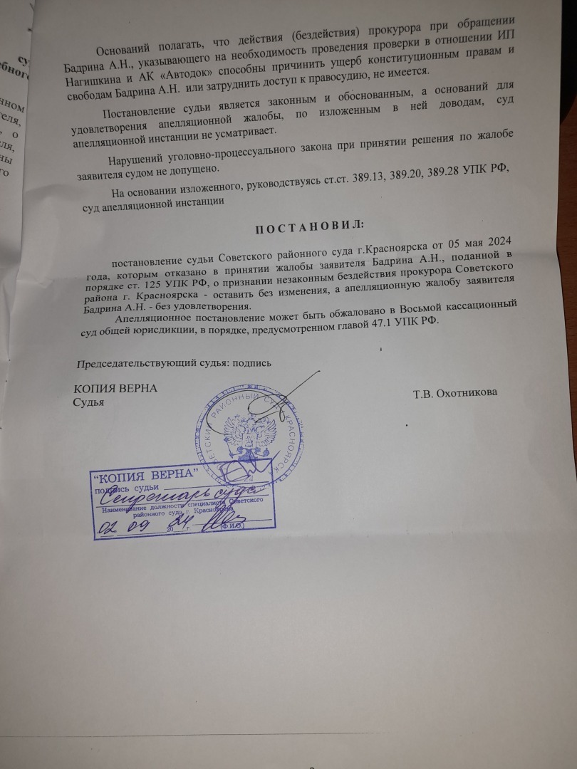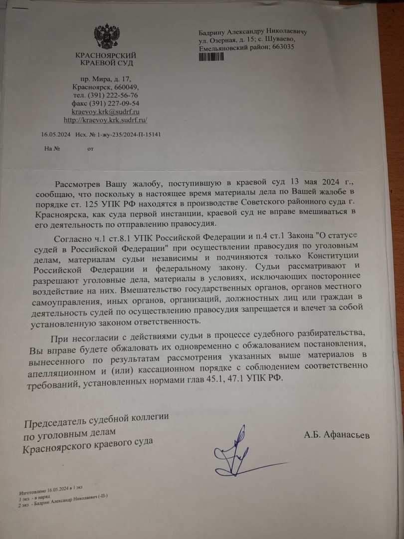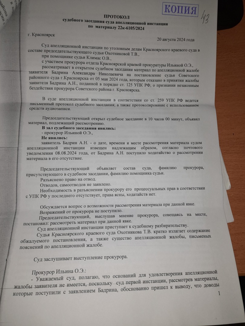 Вот так осуществляется доступ к правосудию по УПК РФ.Респект Вам "многоуважаемая" судья Красноярского краевого суда Охотникова Т.В. при участии прокурора Ильиной О.Э.