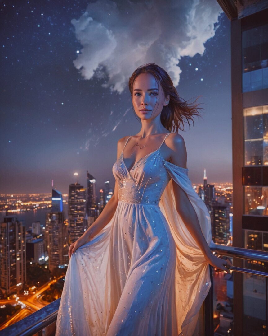 Она стояла на балконе небоскреба, окутанная прохладой летней ночи. Слегка опрокинув голову назад, ее волосы, словно в дымке облаков на высоте небоскреба отражали мягкий блеск ночных прожекторов. Ее взгляд устремлен в бездонную черноту, где миллионы звезд мерцали, словно алмазы, разбросанные по бархату. Казалось, они так близко, что до них можно дотянуться рукой. На секунду она представила себя парящей в этой звездной пыли, утопающей в их неземном свете. Но реальность была иной.