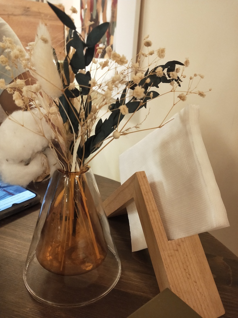 За витриной есть зеркала причудливых круглых форм. На каждом столике необычные вазы с натуральным хлопком и сухоцветами. Стены украшены картинами в стиле лофт, мне они не очень понравились из-за тёмной цветовой гаммы и тревожных цветов.