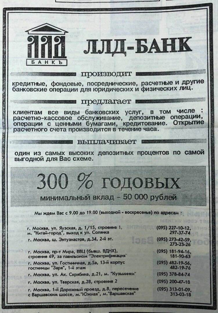 Рекламное объявление "выгодного" банковского вклада в газете конца прошлого века (обратите внимание, что и тогда минимальная сумма была 50 000 рублей - почти так же, как и сейчас):
