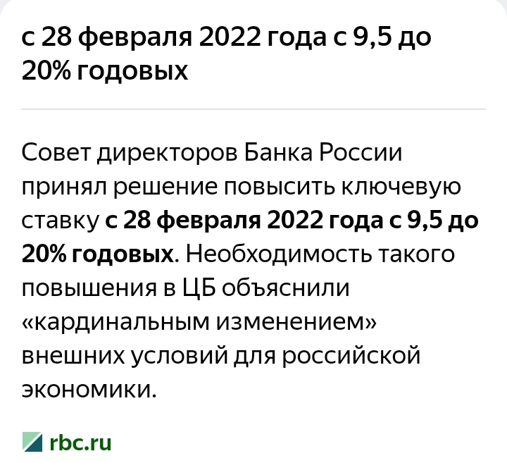 Более чем два года назад - 28 февраля 2022 года ЦБ РФ повысил ключевую ставку с 9,5 % до 20 %