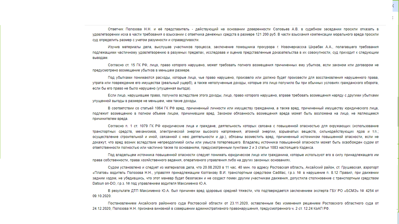 Истец просил взыскать с моего клиента 121 200 рублей за то, что в результате ДТП его авто был поврежден, а он был в аренде и приходилось платить аренду, а авто стояло в ремонте и заработок не приносил. Маразм полный. Основное требование абсолютно незаконное. Плюс моральный вред затребовали 300 000 рублей, что не может быть разумным.