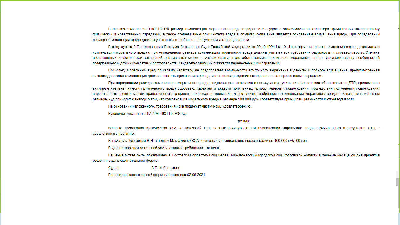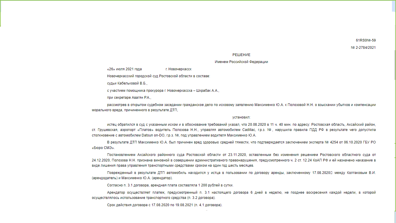 В итоге, решением Новочеркасского городского суда, в удовлетворении основного требования о взыскании по договору аренды отказано в полном объеме. Моральный вред уменьшен в 3 раза, до 100 000 рублей.