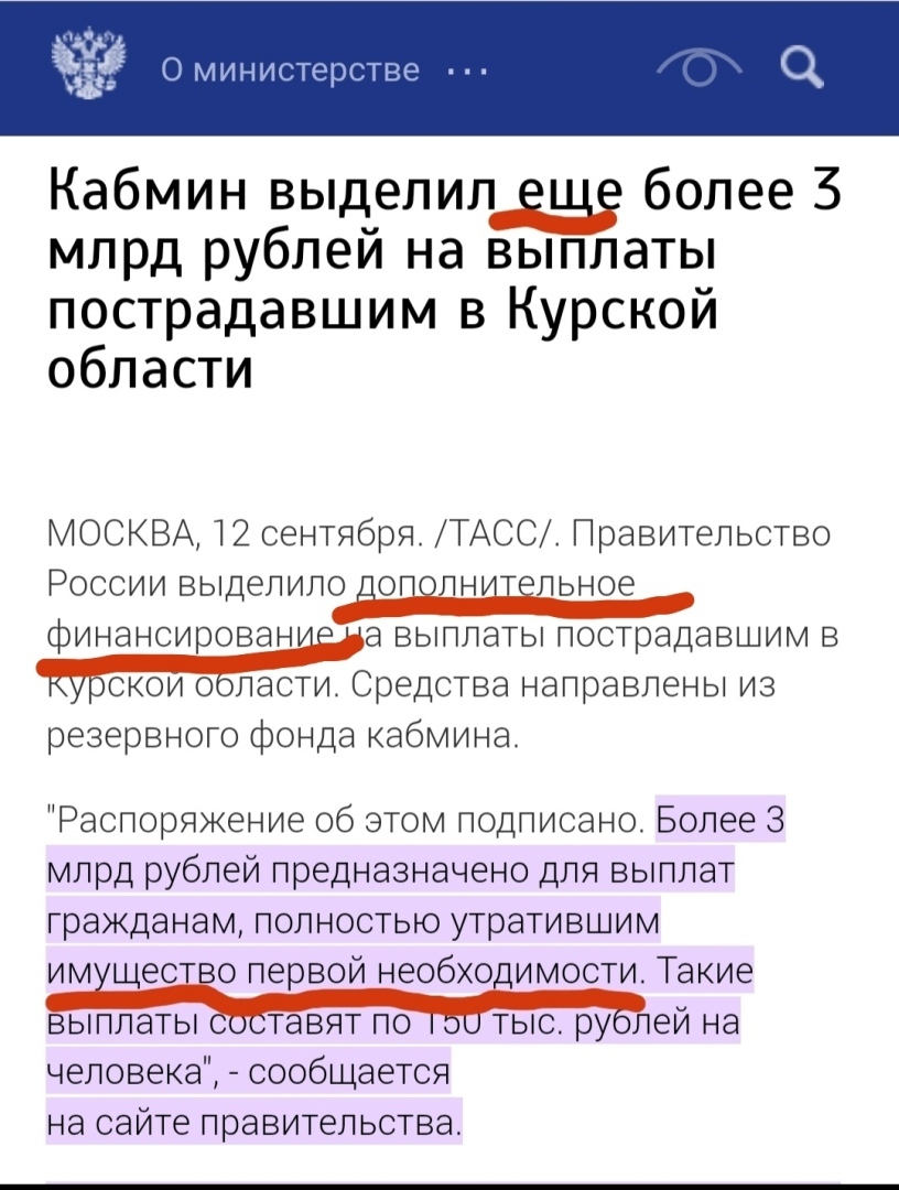 "Министерство финансов выделило более 3 млрд рублей из резервного фонда для выплат жителям Курской области, которые полностью лишились имущества" - экономисты считают, что один день СВО обходится минимум в 20 млрд рублей - это все, что нужно знать о приоритетах власти.