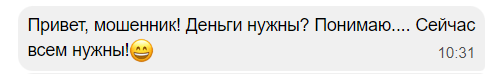 Я никогда так не отвечаю мошенникам. Я всегда заставляю их поработать и потратиться по максимуму. Если, к примеру, мне предлагают антенну, которая подключается хоть к телевизору, хоть к ПК и обеспечивает абсолютно все существующие каналы + интернет на максимальной скорости и все это бесплатно, я заказываю сразу штук 5, ну и конечно, никогда не забираю товар с почты. Если мне звонит оперуполномоченный и сообщает, что мой сын сбил человека насмерть на пешеходном перекрестке и чтобы его не посадили, нужно заплатить 1,5-10 млн рублей, я сразу соглашаюсь, мне назначают встречу: "подойти к станции метро, подождать машину (номер такой-то, марка и цвет такие-то), я конечно, соглашаюсь. И так далее. Никогда не посылаю сразу.