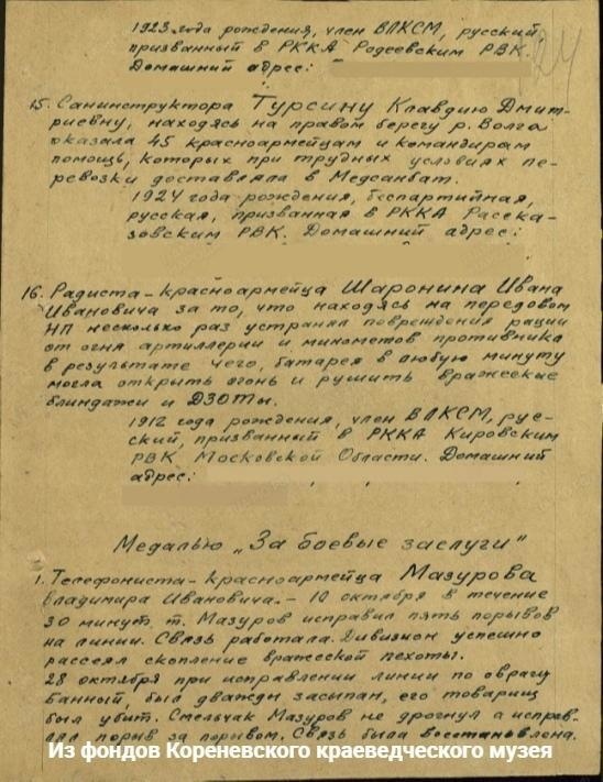Клавдия Дмитриевна Турсина-Войтова - имя, которое навсегда вписано в историю Кореневского района и всей страны. Родившись в 1925 году, она стала частью поколения, которое пережило страшные испытания Великой Отечественной войны. В марте 1942 года, едва переступив порог совершеннолетия, Клавдия Дмитриевна отправилась на фронт, став санинструктором в составе 8-й Гвардейской армии, 39-й гвардейской стрелковой дивизии, 172-го артполка.