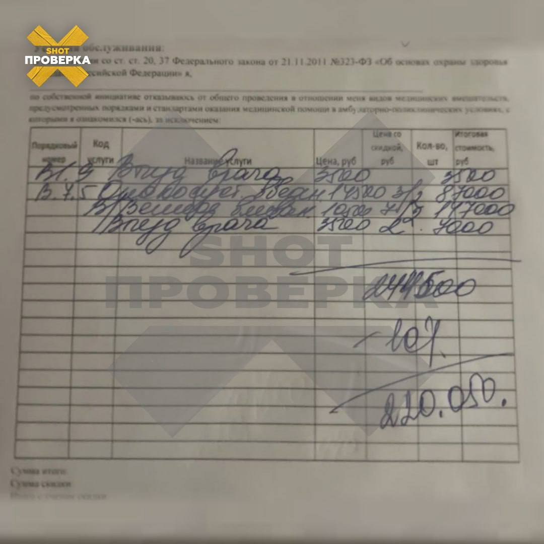 В разговоре с SHOT ПРОВЕРКОЙ медицинский юрист отметил, что высокая стоимость услуг при выездном осмотре в рамках симптоматического лечения невозможна. Сперва необходимо провести полноценное обследование и поставить диагноз; только после этого можно назначать дорогие препараты и рассчитываться в соответствии с прейскурантом.