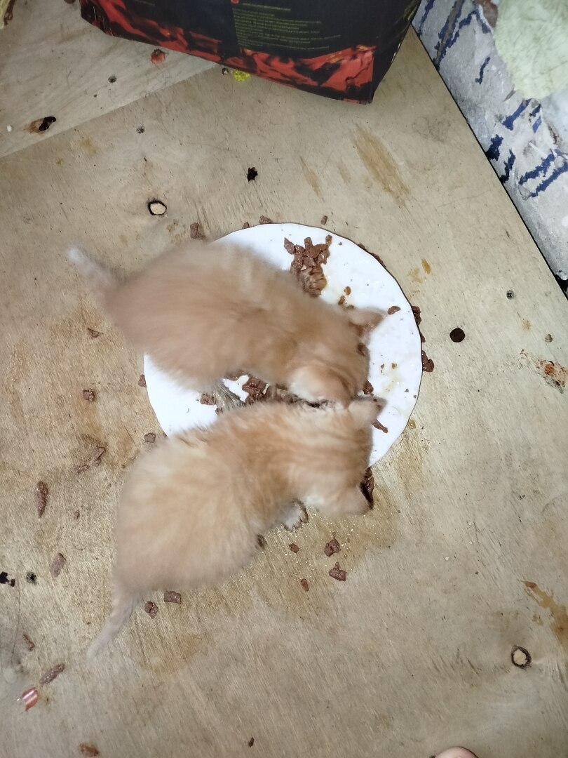 И вот что из этого вышло. Весь пол в Вискасе, постоянно грызли тарелку. Котята все в корме. Так их спать и уложила. Пусть обоизывают друг друга перед сном. Даже не пищалию уснули сразу.