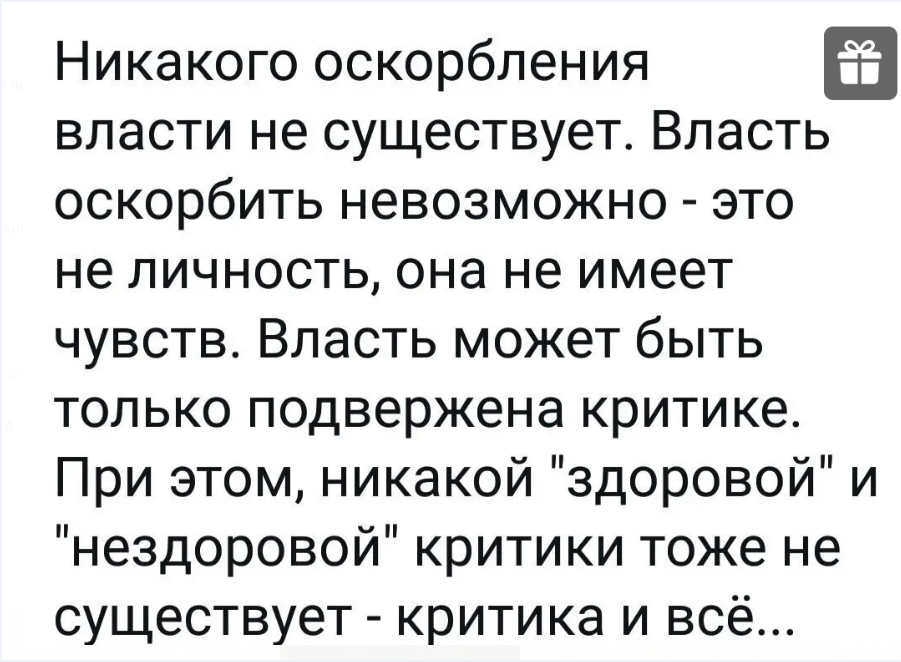 Мы в курсе, но речь идёт об оскорблении власти, а не представителей. Это совсем разные вещи