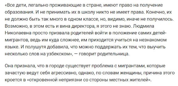 В классе из 19 детей — 6 иностранцев. Русские дети стали жаловаться, что узбекские дети без умолку говорят между собой, отвлекая весь класс от впитывания знаний. На фоне этой информации в родительском чате начался настоящий срач, переросший в угрозы и обращения к «Русской Общине». Те подтащили юристов и вывели ситуацию в публичное медийное поле, чтобы расшатать общественный резонанс.