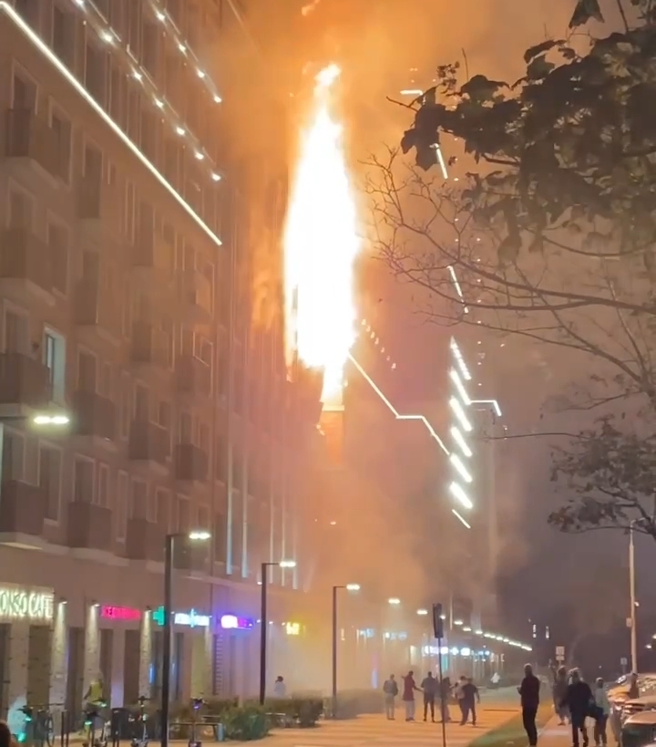 На видео видно, что огонь охватил верхнюю часть элитного дома: К месту пожара прибыли автомобили скорой помощи и спецтехника для ликвидации огня.