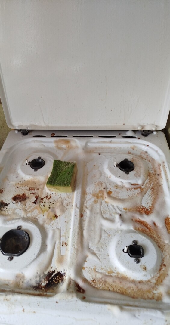 А с плитой у нас вечно что-то. В данном случае - жарка оладьев, печёночных котлеток и утечка крупы. Плита в хлам. Классика.