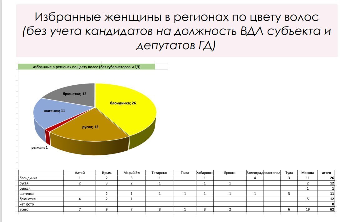 В региональные парламенты попали блондинки (26), брюнетки и русые (по 12), а также шатенки (11) и даже рыжая (1).