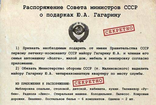 Какие подарки получил от государства Гагарин и его родные, после совершения первого полёта в космос.
