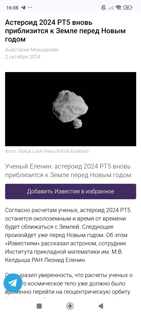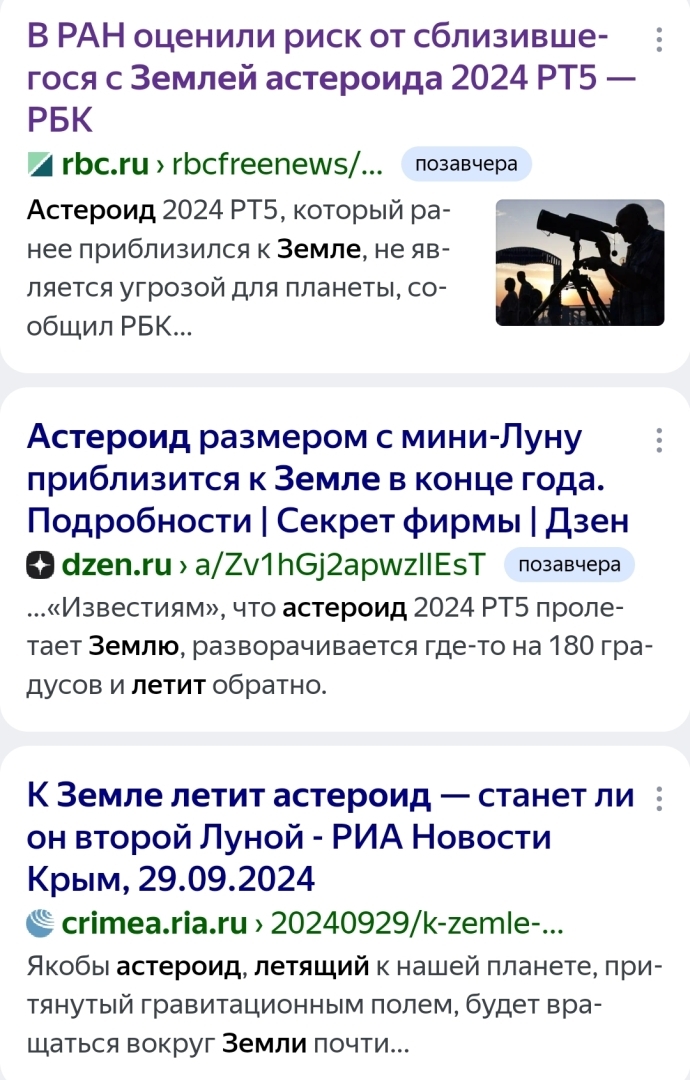 Астероид и правда есть и летит сюда. 😳Согласно расчетам ученых, астероид 2024 PT5 останется околоземным и время от времени будет сближаться с Землей. Следующее произойдет уже перед Новым годом. Об этом «Известиям» рассказал астроном, сотрудник Института прикладной математики им. М.В. Келдыша РАН Леонид Еленин.