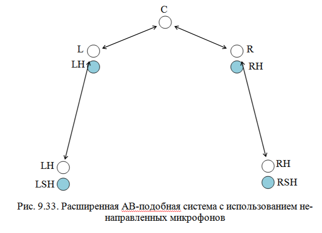 Все рассмотренные выше микрофонные конфигурации в чистом виде могут быть использованы для записи программ с относительно небольшим числом каналов – как правило, до пяти (формат 5.1), если система двумерная, и до девяти, если система трехмерная (например, формат Auro-3D 9.1). Программы для звуковых систем с большим числом каналов требуют применения комбинированных или расширенных систем с использованием уже известных конфигураций в качестве их элементов.