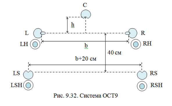 В качестве конкретного варианта ORTF-подобной технологии записи была использована технология ОСТ-9, которая является производной от хорошо известной технологии OCT Surround. Ее достоинствами, как уже говорилось выше, являются низкий уровень перекрестных помех, низкая корреляция диффузных звуков,равномерная и сбалансированная фронтальная локализация и отсутствие прямых звуков в тыловых и высотных каналах, что приводит к увеличению зоны наилучшего прослушивания (рис. 9.32).