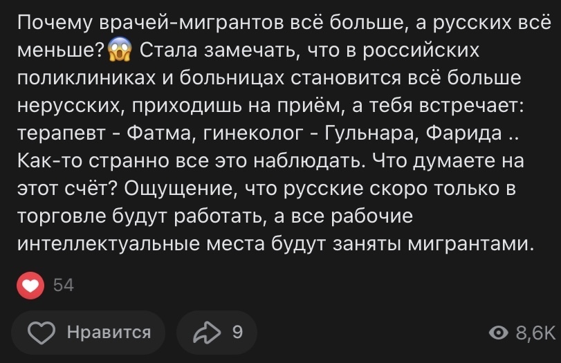 Недовольство россиян растет из-за того, что в поликлиниках становиться больше врачей из ближнего зарубежья и отсутствуют наши специалисты. Некоторые граждане стараются переписаться на прием именно к русскому врачу от медика мигранта.