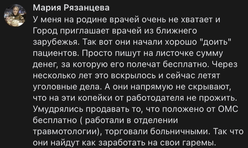 Пожалуйста, в этом комментарии говориться о поборах со стороны врачей мигрантов.