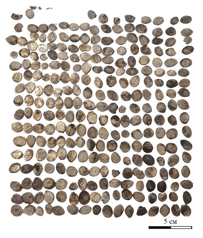 Всего насчитали 266 серебряных монет. На них изображён Георгий Победоносец. Надписи на монетах разные: " Великий князь Иван", "Великий князь Дмитрий ". Современному несведущему человеку так сразу и не определить, что это монеты. Находку предварительно датировали началом 17 века, который вошёл в историю как эпоха Смутного времени.