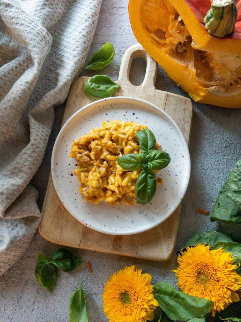 Орзо с мясным фаршем в тыквенно-сырным соусе