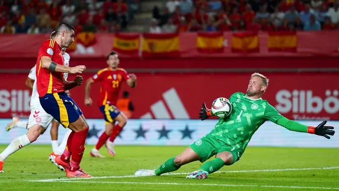 Затем "Фурия Роха" взяла инициативу, заставив Данию опуститься глубоко к своим воротам. Мората и Гримальдо создавали опасные моменты, но в первом тайме испанцы не забили. Датчане оборонялись очень плотно, а из 11 ударов испанцев лишь два попали в створ. Ямаль был менее заметен, чем Мората, а перед самым перерывом Ламина упустил выход один на один с Шмейхелем.