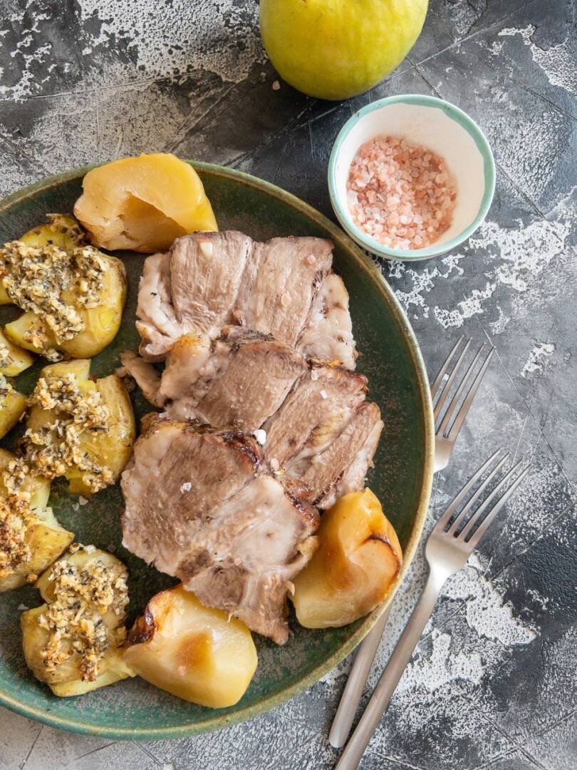 3. Берем форму для выпечки, на дно выкладываем половину лука, сверху кладем мясо и вокруг него раскладываем яблоки и остаток лука. Заливаем все сидром, накрываем форму фольгой и убираем в духовку на час при 180С.