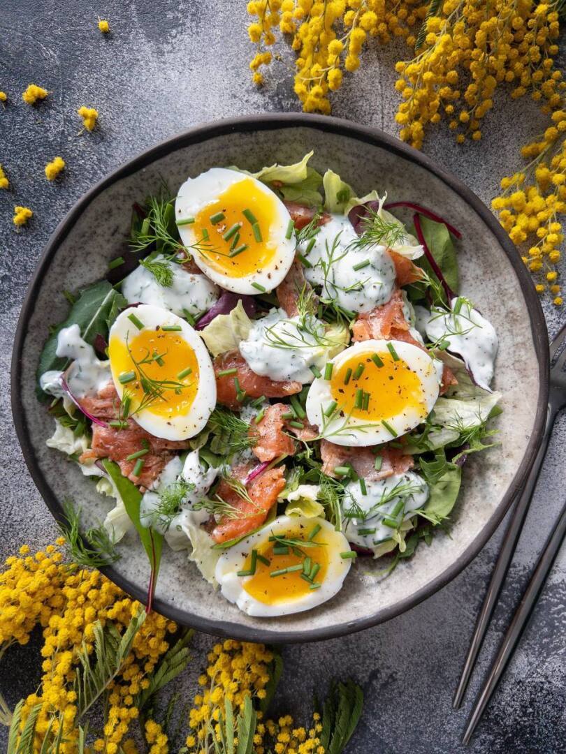 Салат со слабосоленой форелью, яйцом и сырно-укропной заправкой