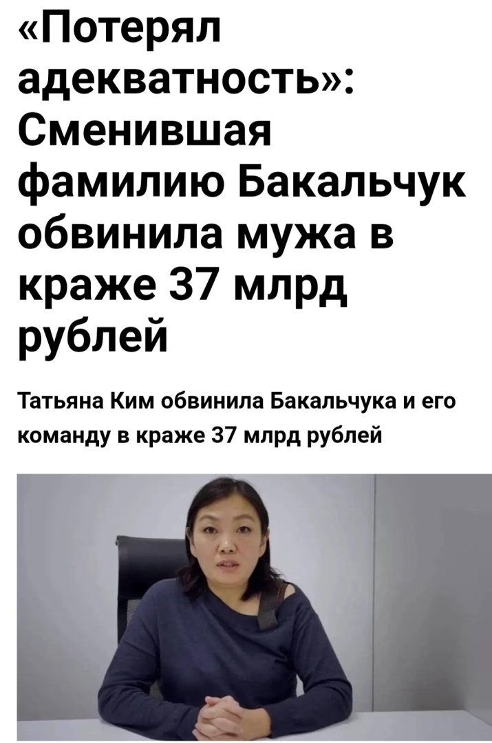 Вчера прошла инфа, что ВБ Девелопмент, где 100% принадлежит мужу, подала лично на него в арбитраж иск на 37 млрд.