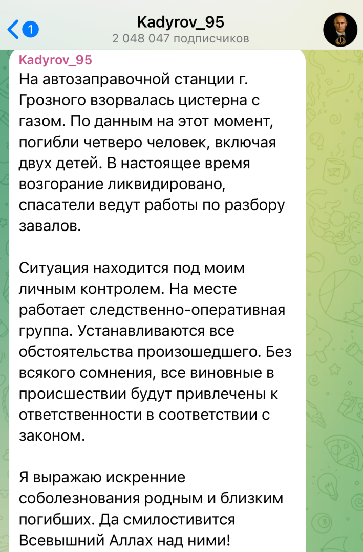 Глава Чечни Рамзан Кадыров уже успел обратиться к родственникам погибших, произнеся для них слова поддержки.