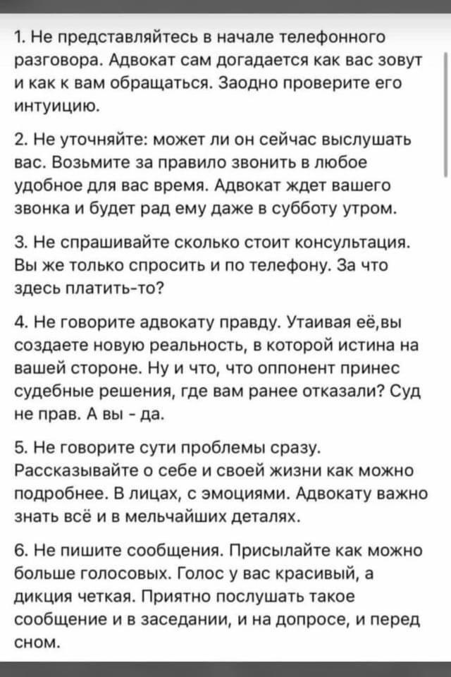 Если вы умеете ценить нашу работу, добро пожаловать. Мы готовы вам помочь. Ну и в конце "памятка" для общения с адвокатом, гуляющая по Интернету.