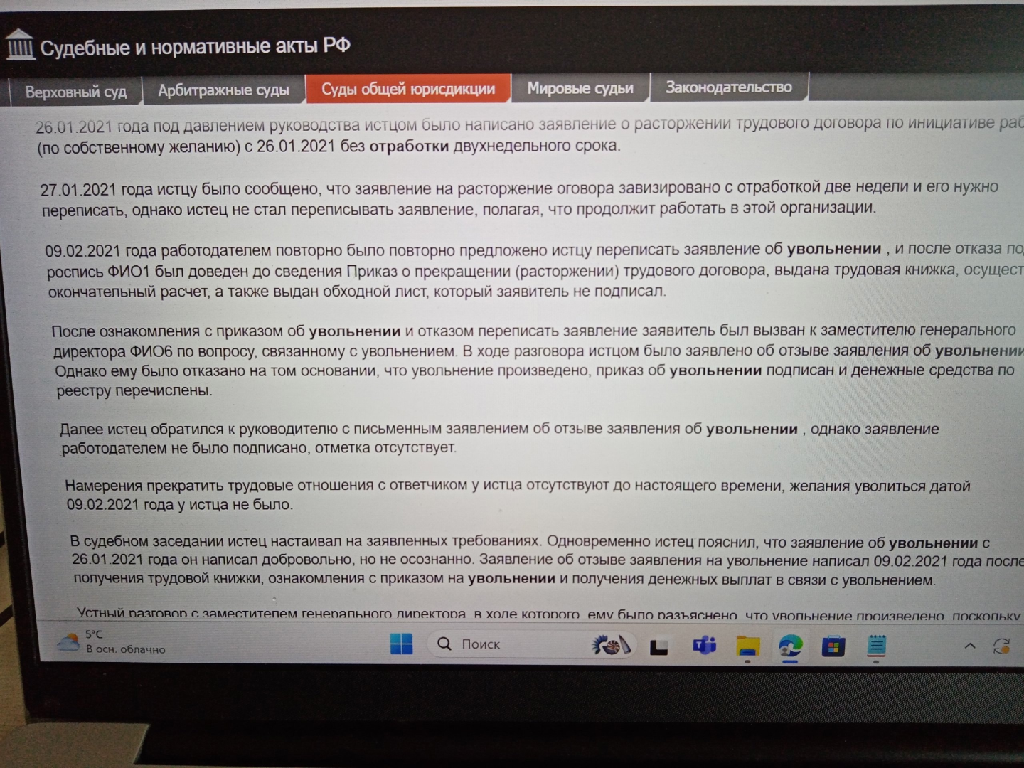 С большим удовольствием, как всегда, предлагаю пример судебной практики, где работник написал заявление об увольнении, отработал, а потом передумал уходить с работы. Чем закончилось дело можете ознакомиться в материалах дела № 2-3674/2021 Одинцовского городского суда Московской области. Фото из архива суда: