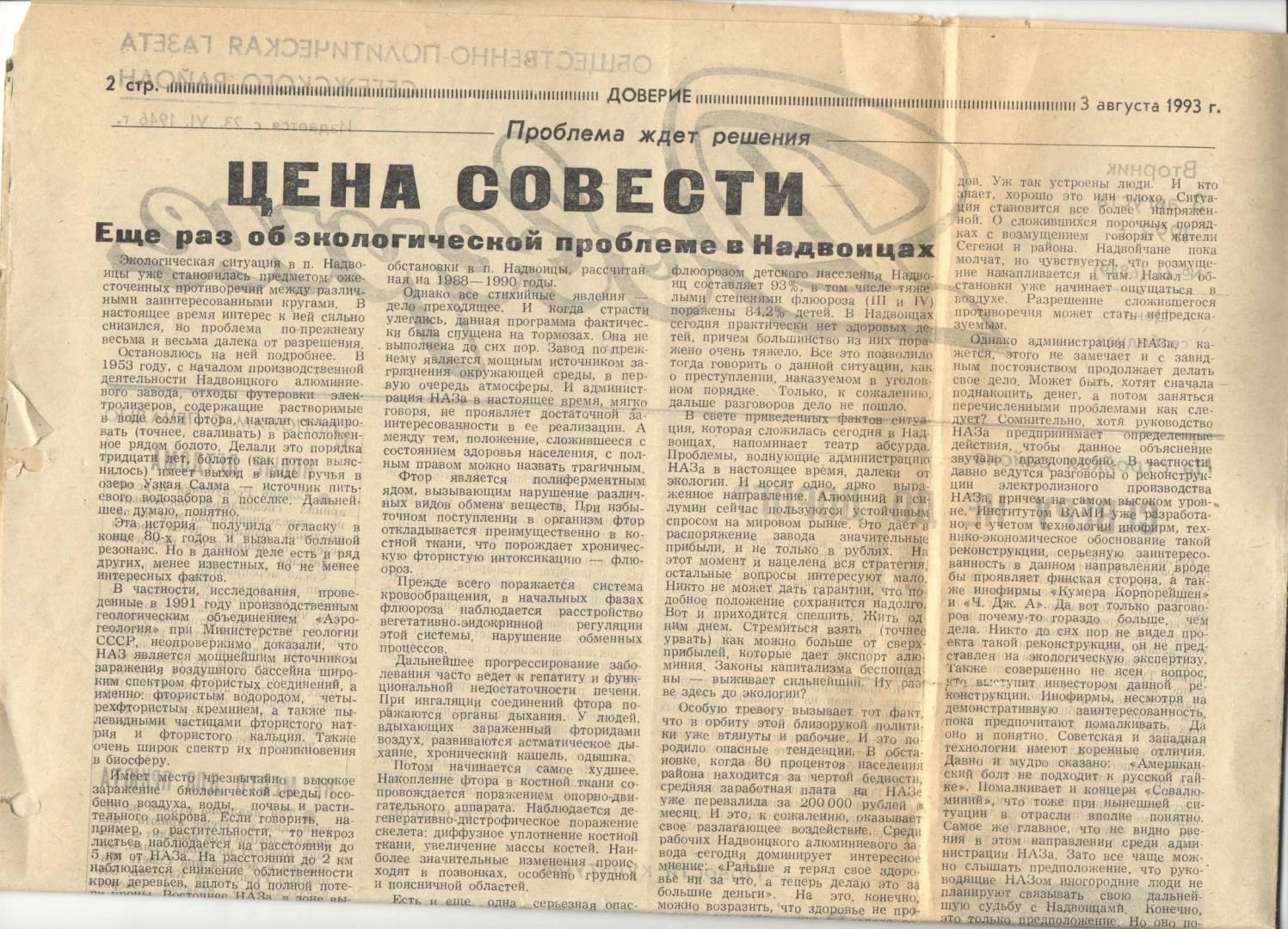 Районная газета «Доверие», 3 августа 1993 г.