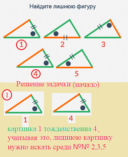Фигуры №1 и №4 одинаковые, значит, одна из них лишняя. Отметила фигуру под №1.
