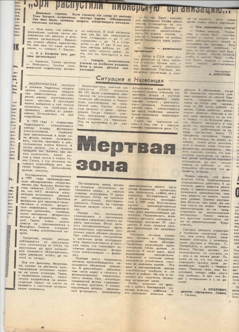 Статья произвела эффект разорвавшейся бомбы. Администрация завода несколько недель носилась с идеей подать на Андрея за неё в суд, но так и не решилась. Да это было и понятно, все цифры и факты были совершенно официальные, а проиграй они суд, что было самым вероятным, то они опозорились бы на всю республику. Причём, именно на всю республику, а не на весь район. Статью скоро опубликовала и республиканская газета «Северный курьер», под названием «Мёртвая зона», и бурные обсуждения ситуации стремительно нарастали, вот скан этой публикации: