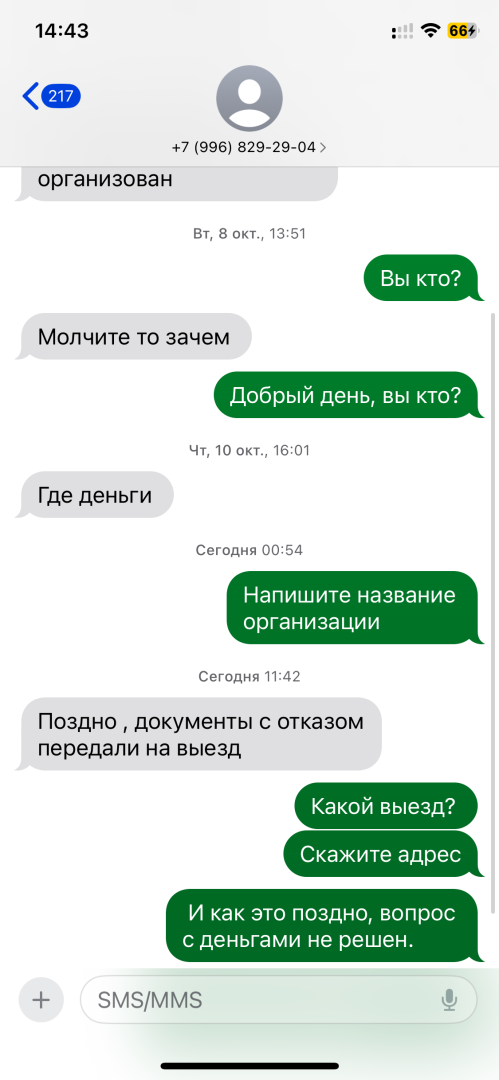 Названивала девушка, не представлялась. Пошли сообщения. 3 недели назад пыталась с ней поговорить, узнать что за организация, кому отдавать. Ничего не назвала, только грубила и говорила «вы и сами знаете», сейчас закрываю все долги. Просрочка могла быть около 60-ти дней. Из-за того, что микрозайм, не понимаю кому должна. Сегодня снова пыталась узнать кому должна, девушка ответила уже документов у нее нет, отдала сотруднику-он приедет. Больше общаться не хочет. Действительно приедут? Очень не хочу этого. Хотела оплатить, да не называют, теперь отказалась со мной общаться. Куда приедут? Приедут ли. Проверяла по кредитной истории, достаточно запутано и понять какой мфо должна не смогла. Переписку прикрепила.