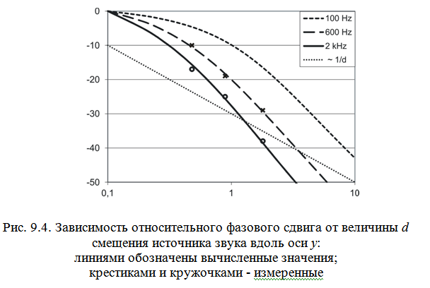Степень модуляции, очевидно, будет уменьшаться по мере перемещения источника звука в направлении оси y. На рис. 9.4 показана эта зависимость для различных частот звуковой волны. При небольших значениях d фазовый сдвиг уменьшается пропорционально 1/d в соответствии с реальной чувствительностью используемого микрофона, а для больших – значительно быстрее. Также этот эффект сильнее проявляется в области высоких частот.