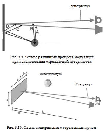 Ввиду того, что и ультразвук, и акустические колебания отражаются от поверхности, как показано на рис.9.9, рассматривать следует сразу четыре отдельных процесса взаимодействия волн. Прямая звуковая волна взаимодействует как с прямым, так и с отраженным ультразвуком (A и B), равно как и отраженная от поверхности звуковая волна (C и D). Всё это – четыре различных случая модуляции. Фазовый сдвиг зависит от длин путей, которые прошли ультразвук и звук до и после взаимодействия. Микрофон вначале детектирует модуляцию B, затем D, C и A. Глубина модуляции зависит от угла между направлениями распространения и от амплитуд звуковых волн. Эти параметры различаются в каждом конкретном случае A, B, C, и D. Также в зависимости от частоты звукового сигнала будет происходить либо усиление сигнала, либо его ослабление.