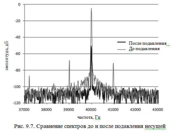 В проводимых экспериментах уровень подавления несущей достигал величины 40 дБ без уменьшения абсолютной величины боковых составляющих. Как только удается уменьшить до необходимого уровня динамический диапазон для ультразвукового микрофона, все последующие компоненты обработки сигнала (особенно аналого-цифровой преобразователь) могут работать с облегченными требованиями. К сожалению, это не относится к генератору ультразвукового сигнала, а также к контроллеру фазы и амплитуды дополнительного сигнала.