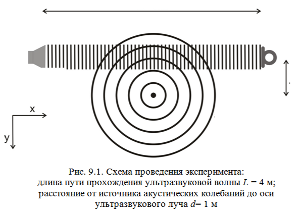 Длина пути, по которому распространяется ультразвуковая волна,здесь значительно больше, чем длина звуковой волныλa. Поэтому величина изменения скорости звука в каждой рассматриваемой точке зависит от ее фактической позиции x вдоль линии между массивом излучателей (передатчиком) и микрофоном (приемником):